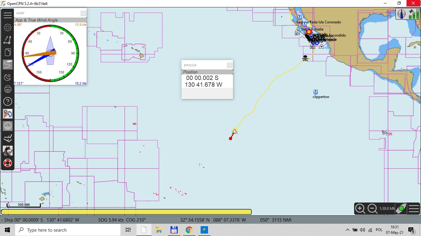 Po 16 dobach żeglugi i przepłynięciu ponad 2175 mil morskich z meksykańskiego La Paz, w piątek 7. maja o godz. 16.31 czasu jachtowego UTC-8, jacht Crystal wrócił na półkulę południową. Nie było nas tutaj od 2019 r., kiedy to odwiedzaliśmy Galapagos, Pitcairn, Polinezję Francuską i Kiritimati. Przeskok na drugą stronę lustra, jak sobie żartujemy, odbył się w bardzo miłych warunkach pogodowych. Wiał nam przyjemny półwiatr o sile 4°B, słoneczko przygrzewało, a Pan Ocean kołysał.