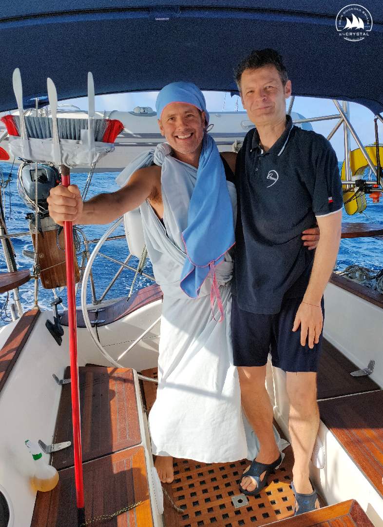 Po chwili w przebraniu i z harpunem w wersji zrób-to-sam, wyskoczył na pokład już jako Namiestnik Neptuna. Rozkazał przytrzymać naszego równikowego nowicjusza Marka i zasłonić mu oczy. Oczywiście wszystko odbywało się przy dużej ilości śmiechu, tym bardziej że Crystal płynęła szybko, falę mieliśmy z boku, więc nasz wysłannik Neptuna musiał się nieźle gimnastykować, żeby nie wywinąć orła w kokpicie.