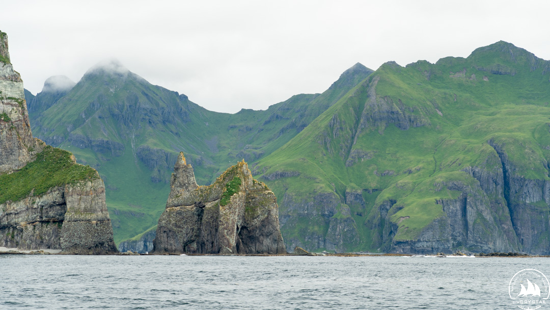 Kiedy wpływaliśmy do zatoki, większa część okolicy spowita była w gęstej mgle. Tym razem wszystko było widać jak na dłoni. Bardzo spektakularnie prezentowała się wyspa Ogangen, leżąca na wyjściu z zatoki. Jest na niej piękny wulkaniczny stożek. Normalnie jestem przyzwyczajony, że stożki wulkanów są pokryte lawą i w związku z tym koloru szaro-brązowego. Ale nie na Aleutach! Tu wszystko jest zielone. Praktycznie każdy centymetr kwadratowy powierzchni jest porośnięty trawą lub mchem. Zasługa to pewnie leciwego wieku tych wulkanów, jak i ogromnych opadów i wilgoci unoszącej się nieustannie w powietrzu.
