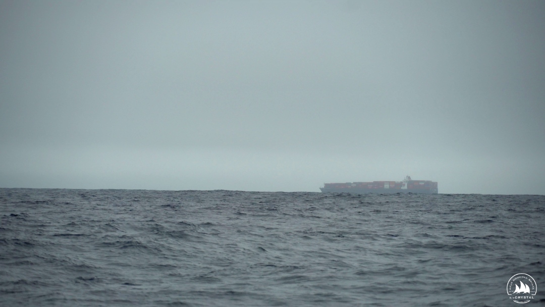 Rano Ola kontrolnie wyjrzała do kokpitu, a tu we mgle mijamy się może w odległości mili z 300-metrowym kontenerowcem, którego na AIS nie było… Miejmy nadzieję, że więcej takich cichociemnych tu nie grasuje.
